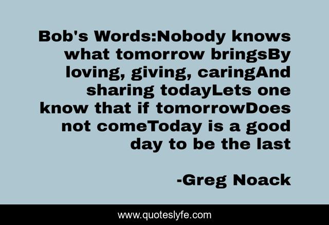 Bob's Words:Nobody knows what tomorrow bringsBy loving, giving, caringAnd sharing todayLets one know that if tomorrowDoes not comeToday is a good day to be the last