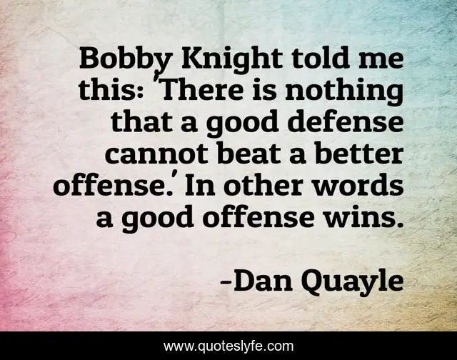 This page presents the quote "Bobby Knight told me this: 'There is nothing that a good defense cannot beat a better offense.' In other words a good offense wins.". Author of this quote is Dan Quayle. This quote is about dumb, sports,.