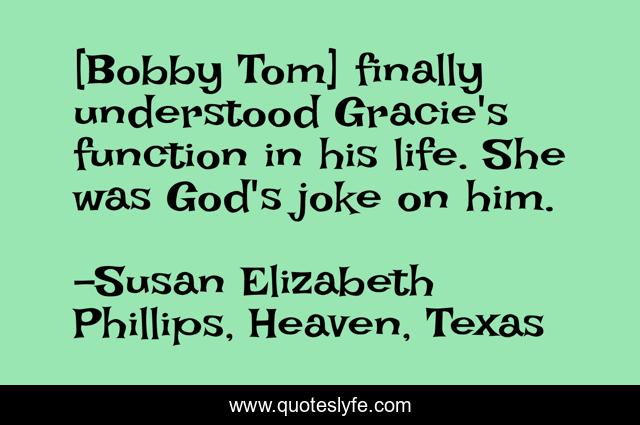 This page presents the quote "[Bobby Tom] finally understood Gracie's function in his life. She was God's joke on him.". Author of this quote is Susan Elizabeth Phillips, Heaven, Texas. This quote is about romance, humor,.