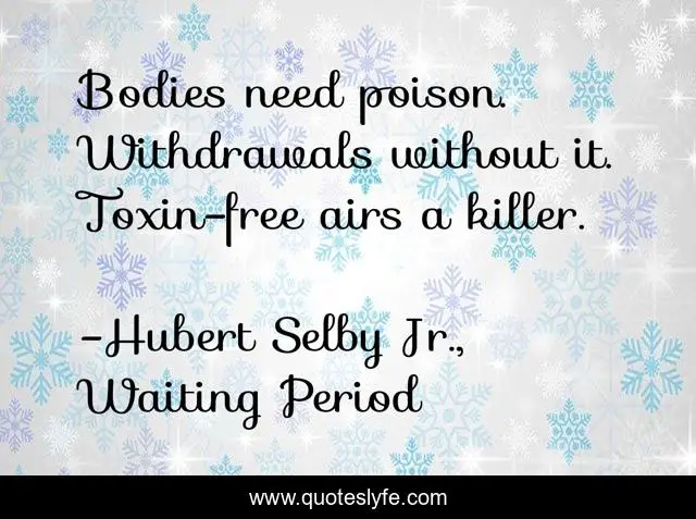 "Hubert Selby Jr., Waiting Period Quotes." Quoteslyfe.com, 2025. Fri. 05 Dec. 2025. <https://www.quoteslyfe.com/quote/Bodies-need-poison-Withdrawals-without-it-Toxin-223806>.