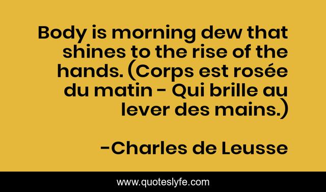 This page presents the quote "Body is morning dew that shines to the rise of the hands. (Corps est rosée du matin - Qui brille au lever des mains.)". Author of this quote is Charles de Leusse. This quote is about body, main, corps, rise, hand, lever, matin, morning,.