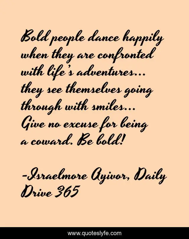 This page presents the quote "Bold people dance happily when they are confronted with life’s adventures... they see themselves going through with smiles... Give no excuse for being a coward. Be bold!". Author of this quote is Israelmore Ayivor, Daily Drive 365. This quote is about cowardice, smiles, food-for-thought, bold, dancing, dance, confront, be-bold, life,.