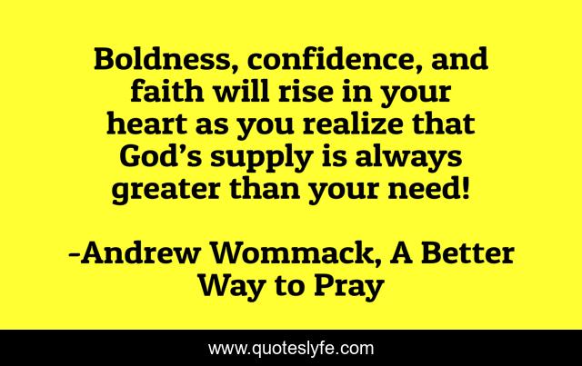 This page presents the quote "Boldness, confidence, and faith will rise in your heart as you realize that God’s supply is always greater than your need!". Author of this quote is Andrew Wommack, A Better Way to Pray. This quote is about faith, needs, god, prayer,.