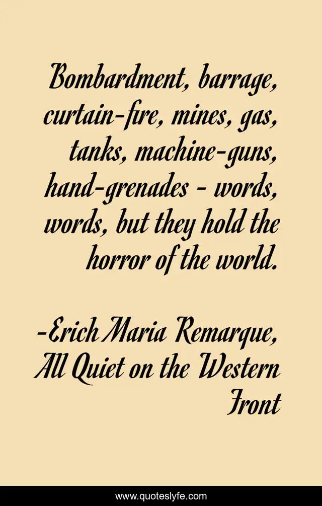 "Erich Maria Remarque, All Quiet on the Western Front Quotes." Quoteslyfe.com, 2025. Mon. 08 Dec. 2025. <https://www.quoteslyfe.com/quote/Bombardment-barrage-curtain-fire-mines-gas-tanks-52079>.