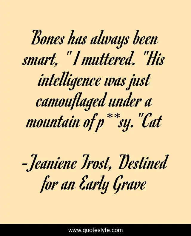 This page presents the quote "Bones has always been smart, " I muttered. "His intelligence was just camouflaged under a mountain of p**sy."Cat". Author of this quote is Jeaniene Frost, Destined for an Early Grave. This quote is about bones, humor, cat,.
