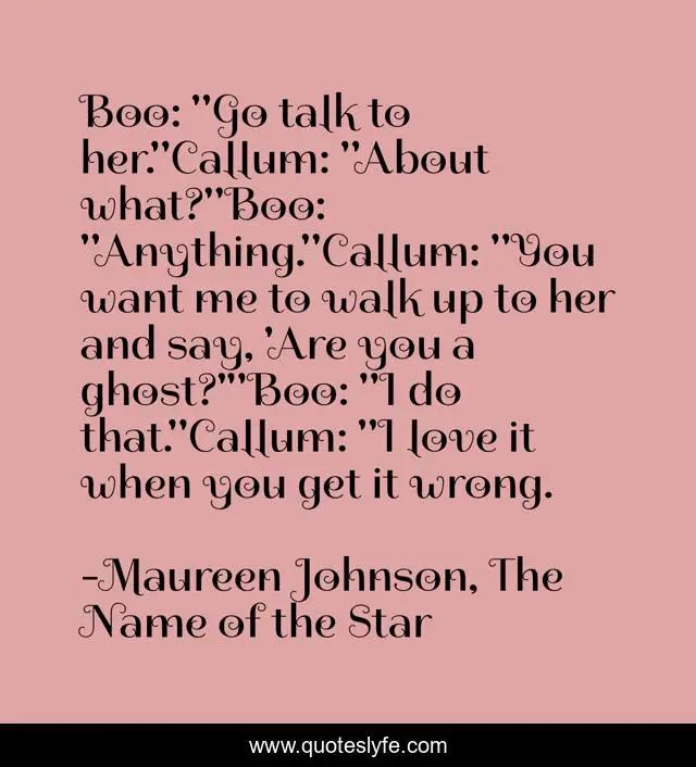 "Maureen Johnson, The Name of the Star Quotes." Quoteslyfe.com, 2025. Fri. 05 Dec. 2025. <https://www.quoteslyfe.com/quote/Boo-Go-talk-to-her-Callum-About-236174>.