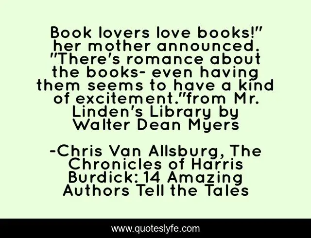 This page presents the quote "Book lovers love books!" her mother announced. "There's romance about the books- even having them seems to have a kind of excitement."from Mr. Linden's Library by Walter Dean Myers". Author of this quote is Chris Van Allsburg, The Chronicles of Harris Burdick: 14 Amazing Authors Tell the Tales. .