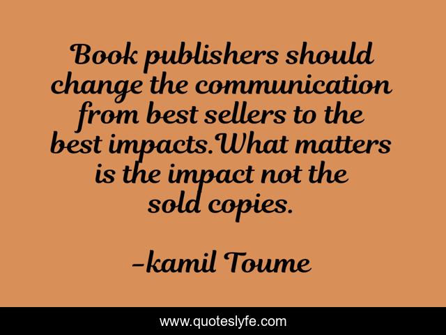 This page presents the quote "Book publishers should change the communication from best sellers to the best impacts.What matters is the impact not the sold copies.". Author of this quote is kamil Toume. This quote is about communication, books, strategy,.