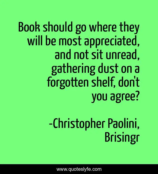This page presents the quote "Book should go where they will be most appreciated, and not sit unread, gathering dust on a forgotten shelf, don't you agree?". Author of this quote is Christopher Paolini, Brisingr. This quote is about brisingr, book, christopher-paolini, library, reading,.