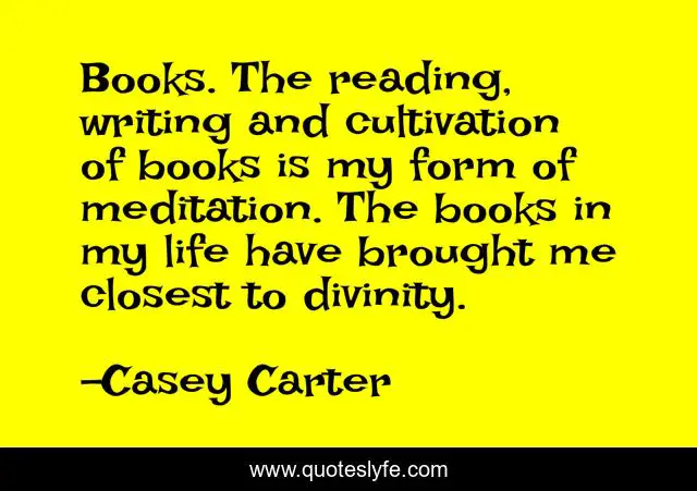 This page presents the quote "Books. The reading, writing and cultivation of books is my form of meditation. The books in my life have brought me closest to divinity.". Author of this quote is Casey Carter. This quote is about reading-books, meditation, divinity, casey-carter,.
