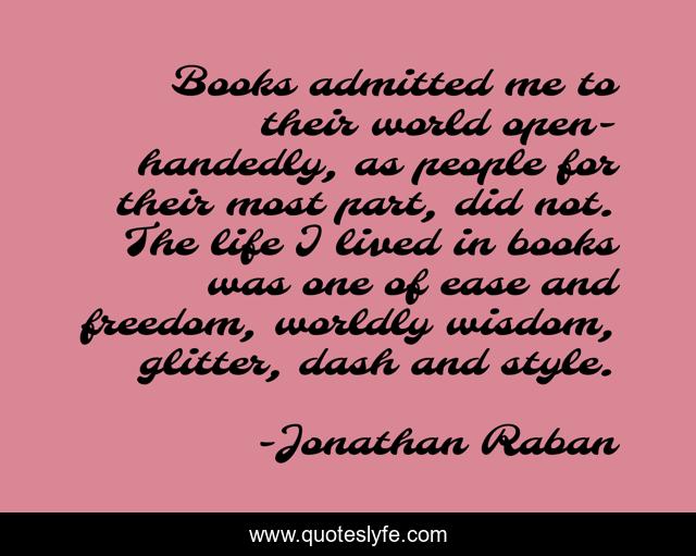 This page presents the quote "Books admitted me to their world open-handedly, as people for their most part, did not. The life I lived in books was one of ease and freedom, worldly wisdom, glitter, dash and style.". Author of this quote is Jonathan Raban. .