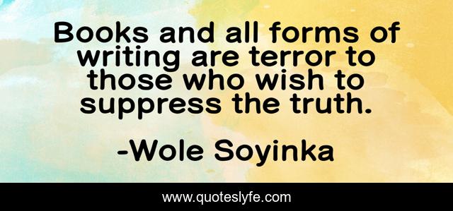 This page presents the quote "Books and all forms of writing are terror to those who wish to suppress the truth.". Author of this quote is Wole Soyinka. This quote is about terror, wish, writing,.