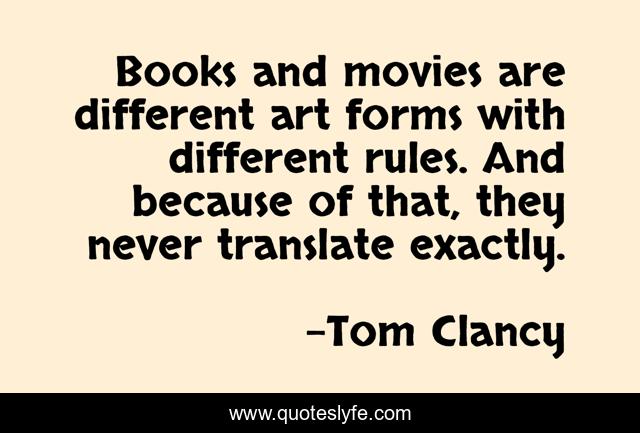 This page presents the quote "Books and movies are different art forms with different rules. And because of that, they never translate exactly.". Author of this quote is Tom Clancy. This quote is about rules, art,.