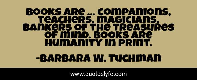 This page presents the quote "Books are ... companions, teachers, magicians, bankers of the treasures of mind. Books are humanity in print.". Author of this quote is Barbara W. Tuchman. This quote is about books, humanity,.