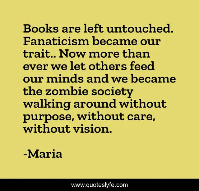 This page presents the quote "Books are left untouched. Fanaticism became our trait.. Now more than ever we let others feed our minds and we became the zombie society walking around without purpose, without care, without vision.". Author of this quote is Maria. This quote is about behaviour, attitude, fanaticism,.