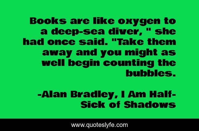 This page presents the quote "Books are like oxygen to a deep-sea diver, " she had once said. "Take them away and you might as well begin counting the bubbles.". Author of this quote is Alan Bradley, I Am Half-Sick of Shadows. This quote is about books, reading,.