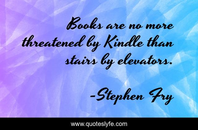 This page presents the quote "Books are no more threatened by Kindle than stairs by elevators.". Author of this quote is Stephen Fry. This quote is about kindle, books, reading, e-readers,.
