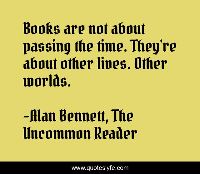This page presents the quote "Books are not about passing the time. They're about other lives. Other worlds.". Author of this quote is Alan Bennett, The Uncommon Reader. .