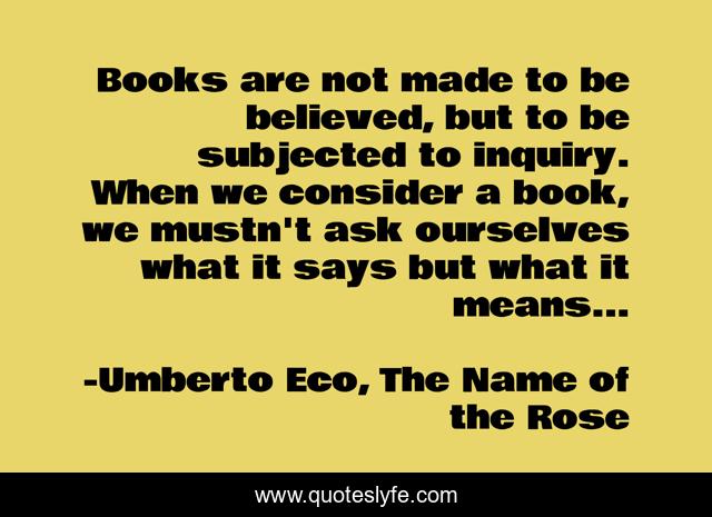 This page presents the quote "Books are not made to be believed, but to be subjected to inquiry. When we consider a book, we mustn't ask ourselves what it says but what it means...". Author of this quote is Umberto Eco, The Name of the Rose. .