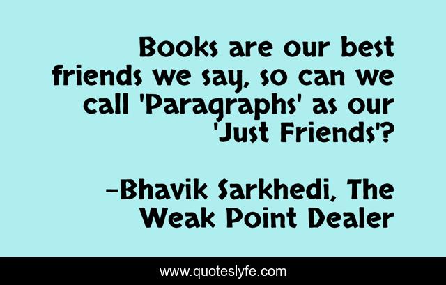 "Bhavik Sarkhedi, The Weak Point Dealer Quotes." Quoteslyfe.com, 2025. Sat. 06 Dec. 2025. <https://www.quoteslyfe.com/quote/Books-are-our-best-friends-we-say-50772>.