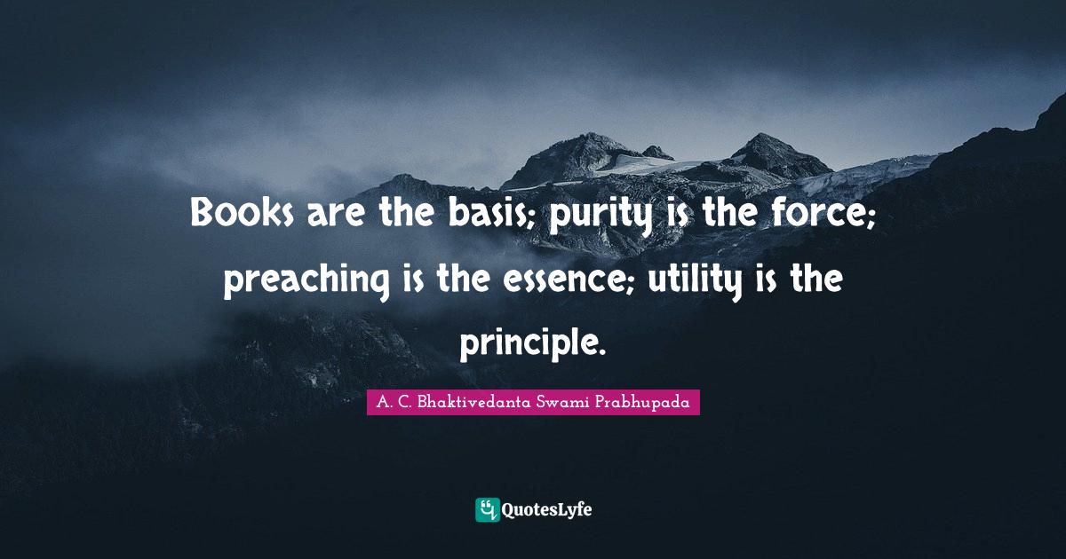 This page presents the quote "Books are the basis; purity is the force; preaching is the essence; utility is the principle.". Author of this quote is A. C. Bhaktivedanta Swami Prabhupada. This quote is about essence, force, utility, preaching, principles, book, purity,.