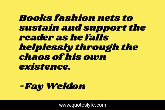 This page presents the quote "Books fashion nets to sustain and support the reader as he falls helplessly through the chaos of his own existence.". Author of this quote is Fay Weldon. This quote is about existence, life, books, readers,.