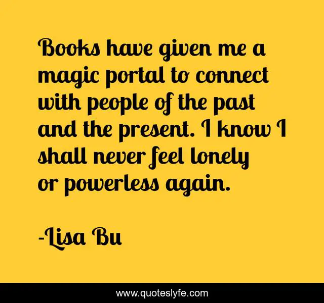 This page presents the quote "Books have given me a magic portal to connect with people of the past and the present. I know I shall never feel lonely or powerless again.". Author of this quote is Lisa Bu. This quote is about power, loneliness, past, books, portal, connection-with-people, reading, present, literacy,.