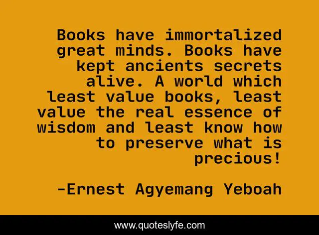 This page presents the quote "Books have immortalized great minds. Books have kept ancients secrets alive. A world which least value books, least value the real essence of wisdom and least know how to preserve what is precious!". Author of this quote is Ernest Agyemang Yeboah. This quote is about life, good-books, great-minds, preserving-wisdom, philosophy, world-book-day, the-essence-of-time, reading-books, books,.
