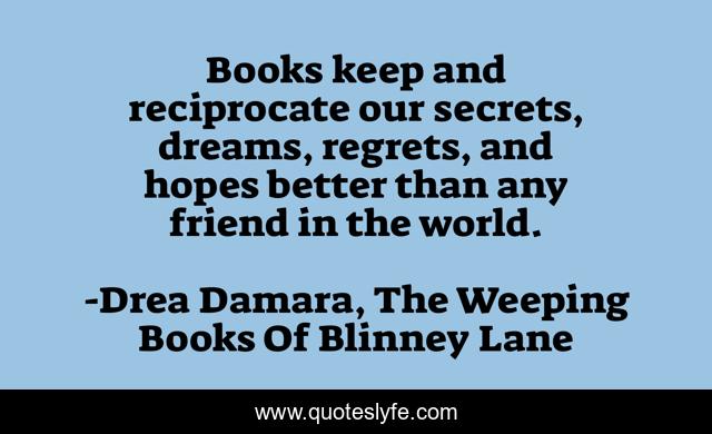 This page presents the quote "Books keep and reciprocate our secrets, dreams, regrets, and hopes better than any friend in the world.". Author of this quote is Drea Damara, The Weeping Books Of Blinney Lane. This quote is about regrets, weeping-books, books, quotes-on-books, hopes, friendship, regrets-heartache, dreams,.