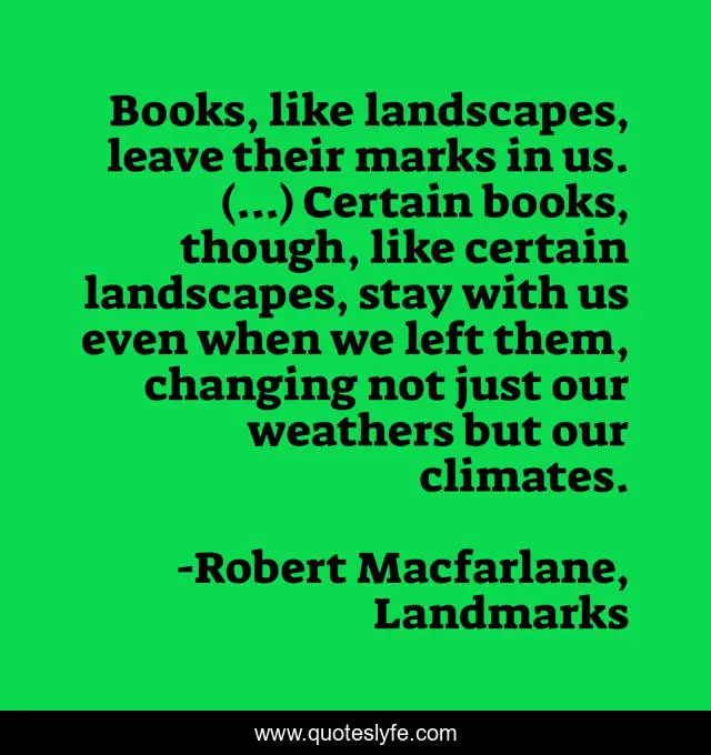 "Robert Macfarlane, Landmarks Quotes." Quoteslyfe.com, 2025. Fri. 05 Dec. 2025. <https://www.quoteslyfe.com/quote/Books-like-landscapes-leave-their-marks-in-159161>.