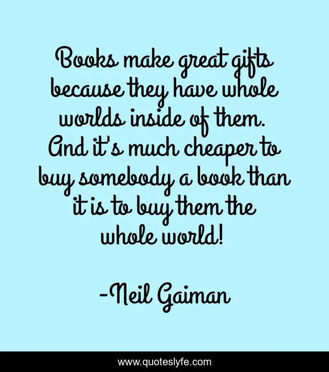 This page presents the quote "Books make great gifts because they have whole worlds inside of them. And it's much cheaper to buy somebody a book than it is to buy them the whole world!". Author of this quote is Neil Gaiman. This quote is about gifts, books,.