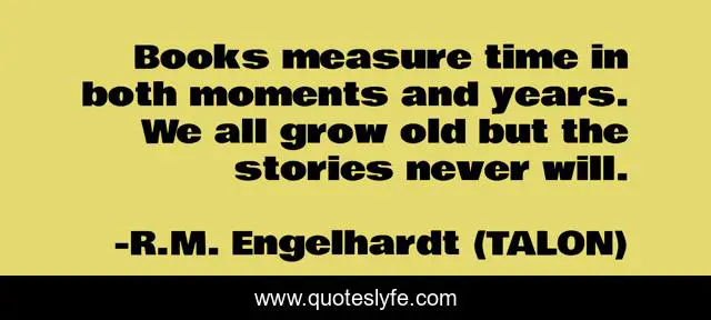 This page presents the quote "Books measure time in both moments and years. We all grow old but the stories never will.". Author of this quote is R.M. Engelhardt (TALON). This quote is about books, stories, poetry, inspirationalpiration, writing,.