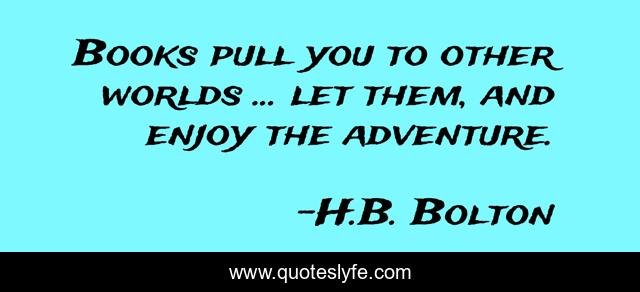 This page presents the quote "Books pull you to other worlds ... let them, and enjoy the adventure.". Author of this quote is H.B. Bolton. This quote is about fantasy, books, adventure, inspirational, enthusiasm,.