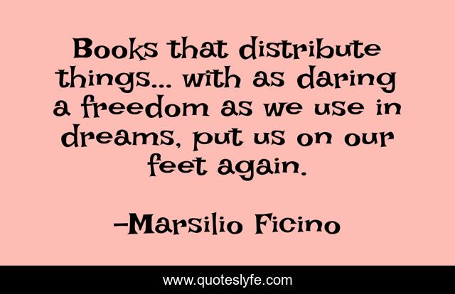 This page presents the quote "Books that distribute things... with as daring a freedom as we use in dreams, put us on our feet again.". Author of this quote is Marsilio Ficino. This quote is about feet, freedom, things,.
