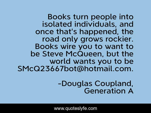 This page presents the quote "Books turn people into isolated individuals, and once that's happened, the road only grows rockier. Books wire you to want to be Steve McQueen, but the world wants you to be [email protected].". Author of this quote is Douglas Coupland, Generation A. This quote is about society, individuality, books, reading,.