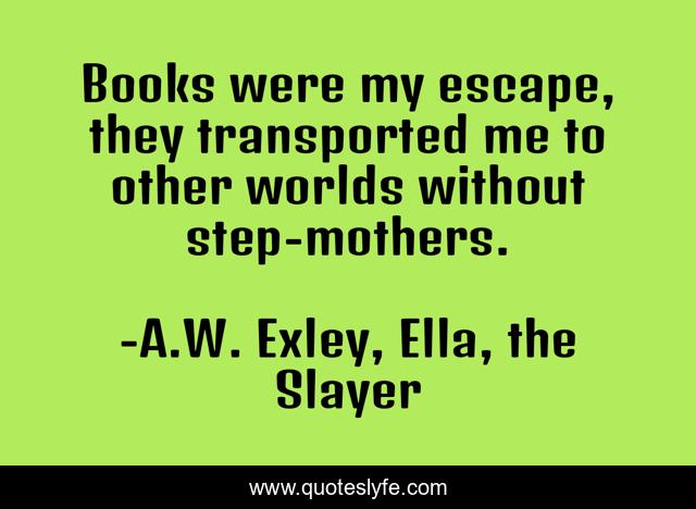 This page presents the quote "Books were my escape, they transported me to other worlds without step-mothers.". Author of this quote is A.W. Exley, Ella, the Slayer. This quote is about bookworms, books, escape,.