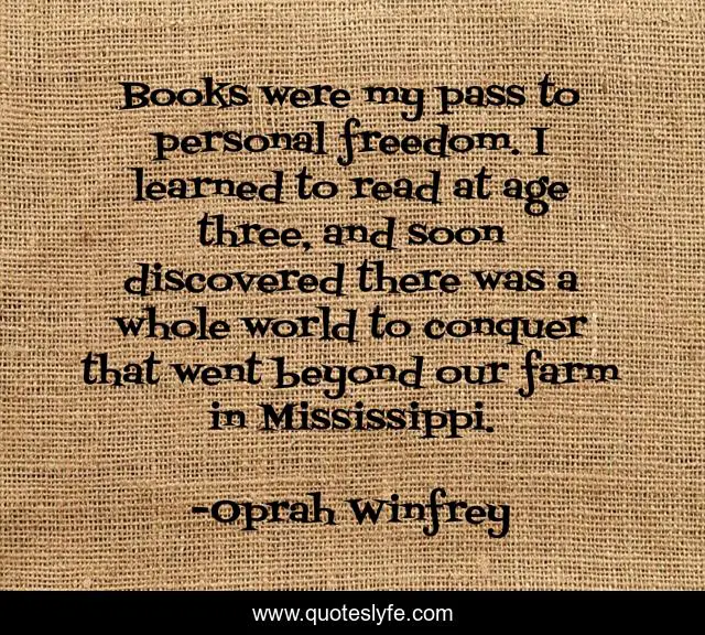 This page presents the quote "Books were my pass to personal freedom. I learned to read at age three, and soon discovered there was a whole world to conquer that went beyond our farm in Mississippi.". Author of this quote is Oprah Winfrey. This quote is about freedom, conquer, world,.