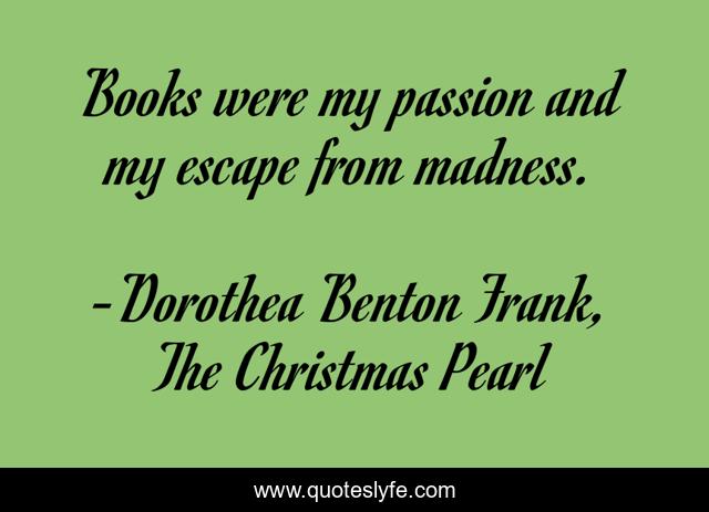 This page presents the quote "Books were my passion and my escape from madness.". Author of this quote is Dorothea Benton Frank, The Christmas Pearl. This quote is about books, reading,.