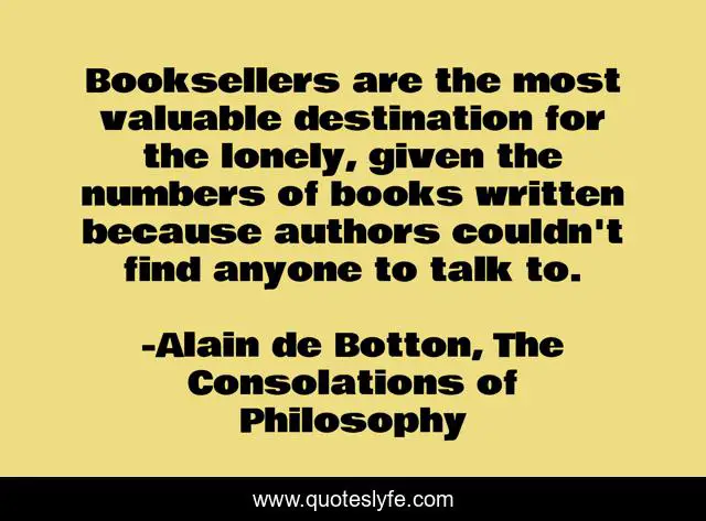 This page presents the quote "Booksellers are the most valuable destination for the lonely, given the numbers of books written because authors couldn't find anyone to talk to.". Author of this quote is Alain de Botton, The Consolations of Philosophy. This quote is about loneliness, books, booksellers,.