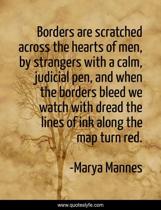 "Marya Mannes Quotes." Quoteslyfe.com, 2025. Fri. 05 Dec. 2025. <https://www.quoteslyfe.com/quote/Borders-are-scratched-across-the-hearts-of-53013>.