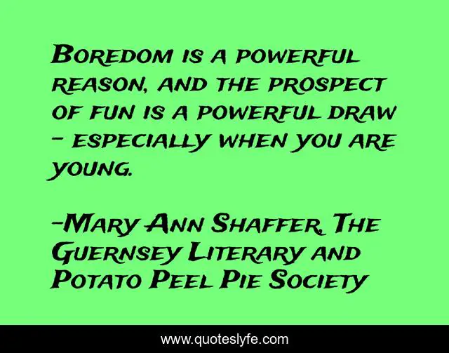 This page presents the quote "Boredom is a powerful reason, and the prospect of fun is a powerful draw - especially when you are young.". Author of this quote is Mary Ann Shaffer, The Guernsey Literary and Potato Peel Pie Society. This quote is about boredom, growing-up,.