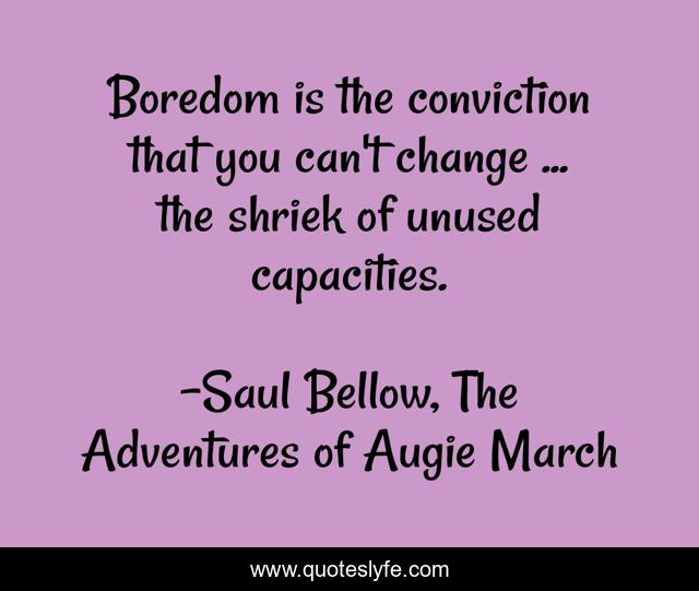 This page presents the quote "Boredom is the conviction that you can't change ... the shriek of unused capacities.". Author of this quote is Saul Bellow, The Adventures of Augie March. This quote is about abilities, boredom, fulfillment,.
