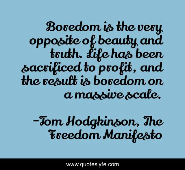 This page presents the quote "Boredom is the very opposite of beauty and truth. Life has been sacrificed to profit, and the result is boredom on a massive scale.". Author of this quote is Tom Hodgkinson, The Freedom Manifesto. This quote is about beauty, boredom, truth,.