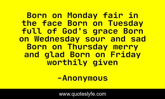 This page presents the quote "Born on Monday fair in the face Born on Tuesday full of God's grace Born on Wednesday sour and sad Born on Thursday merry and glad Born on Friday worthily given". Author of this quote is Anonymous. .