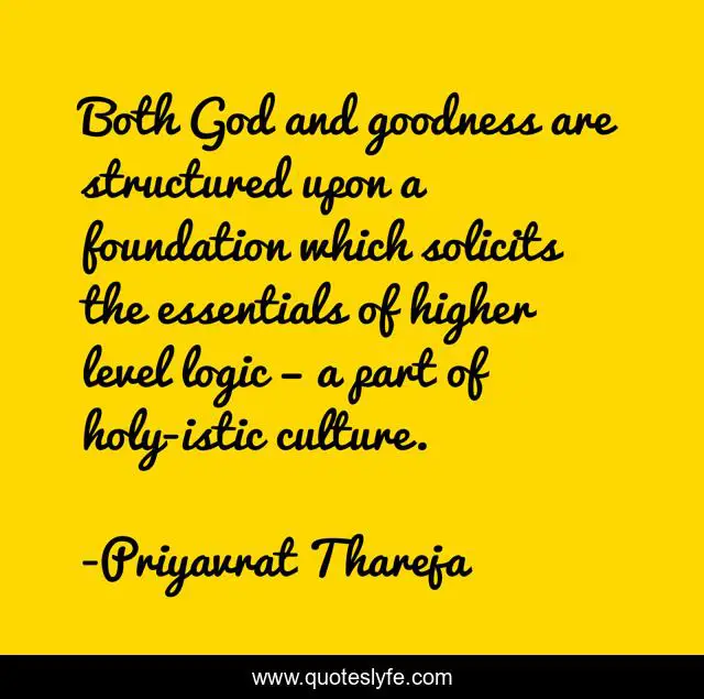 This page presents the quote "Both God and goodness are structured upon a foundation which solicits the essentials of higher level logic – a part of holy-istic culture.". Author of this quote is Priyavrat Thareja. This quote is about god, higher-level, goodness, holy,.