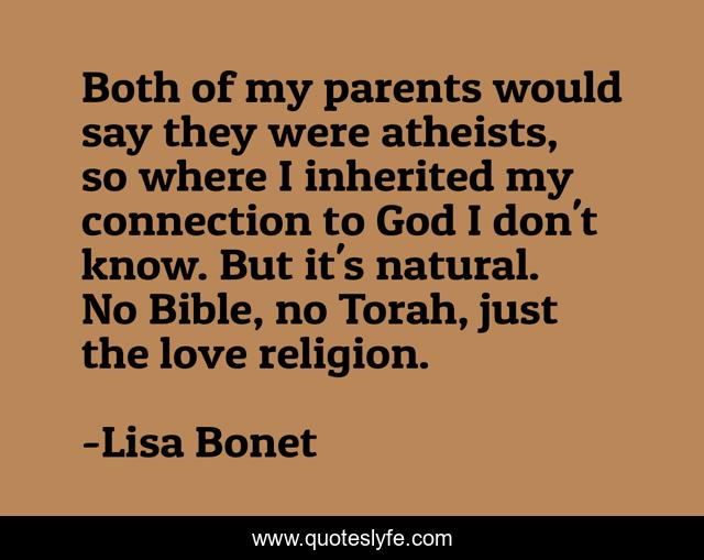 This page presents the quote "Both of my parents would say they were atheists, so where I inherited my connection to God I don't know. But it's natural. No Bible, no Torah, just the love religion.". Author of this quote is Lisa Bonet. This quote is about god, love, affection, parents,.