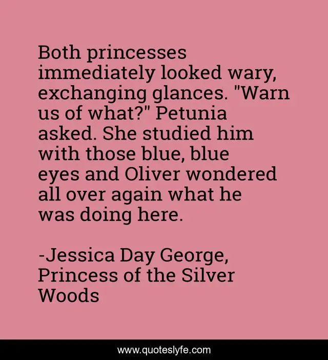 This page presents the quote "Both princesses immediately looked wary, exchanging glances. "Warn us of what?" Petunia asked. She studied him with those blue, blue eyes and Oliver wondered all over again what he was doing here.". Author of this quote is Jessica Day George, Princess of the Silver Woods. This quote is about cute, oliver, petunia,.