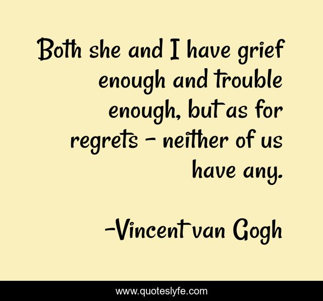 This page presents the quote "Both she and I have grief enough and trouble enough, but as for regrets – neither of us have any.". Author of this quote is Vincent van Gogh. This quote is about grief, life, regret, she-and-i, regrets, past, enough, future, trouble,.