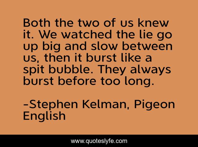 This page presents the quote "Both the two of us knew it. We watched the lie go up big and slow between us, then it burst like a spit bubble. They always burst before too long.". Author of this quote is Stephen Kelman, Pigeon English. This quote is about lie, coming-of-age, truth,.