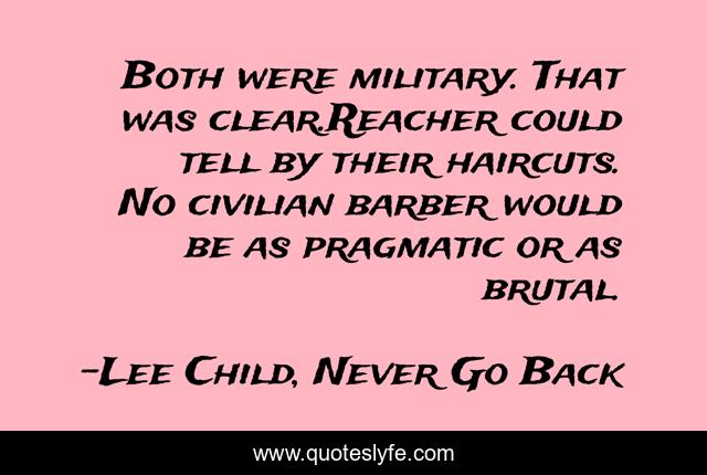 This page presents the quote "Both were military. That was clear.Reacher could tell by their haircuts. No civilian barber would be as pragmatic or as brutal.". Author of this quote is Lee Child, Never Go Back. This quote is about wit, humor, smart,.